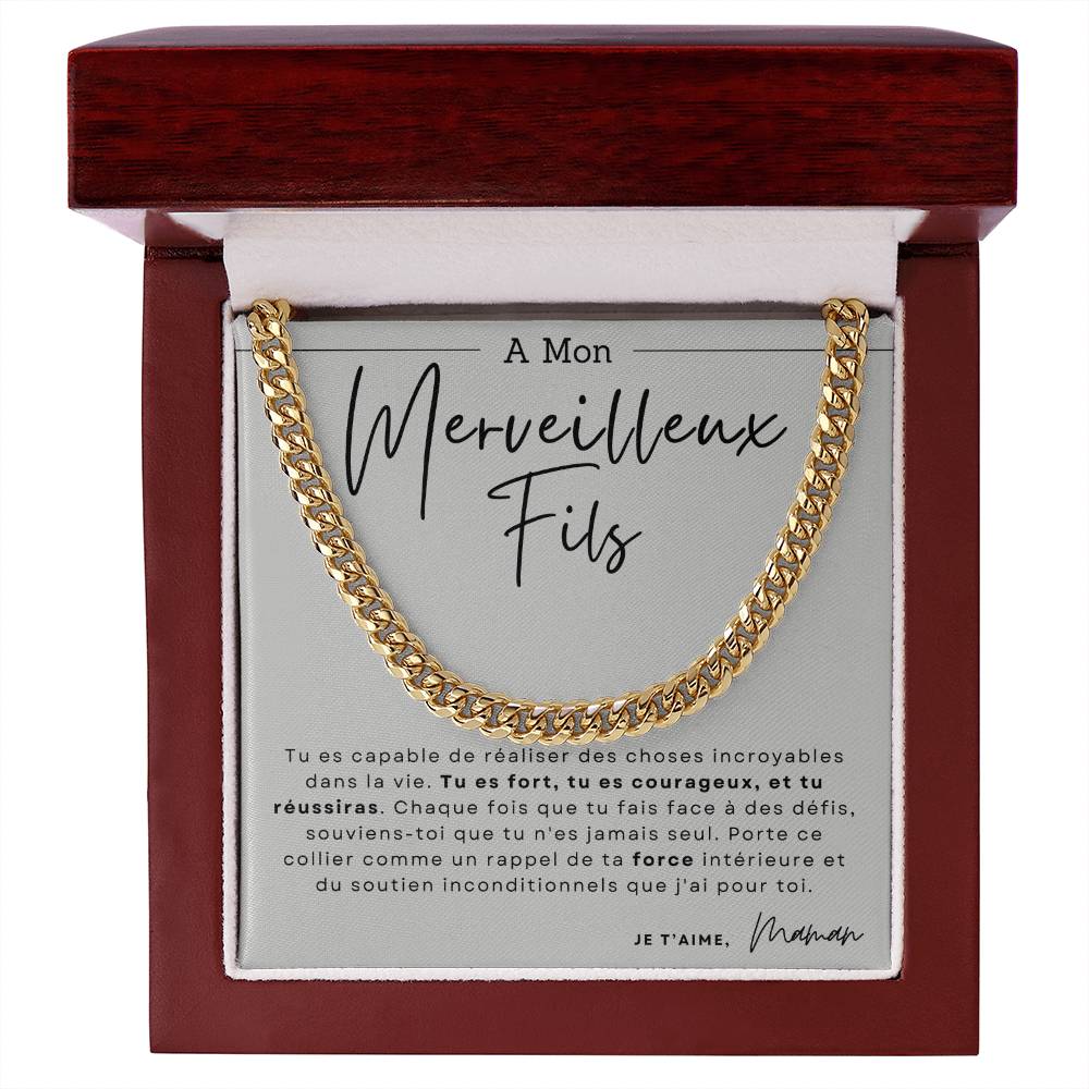 "Tu es fort, tu es courageux, et tu réussiras. Porte ce collier comme un rappel de ta force intérieure et de mon amour inconditionnel."