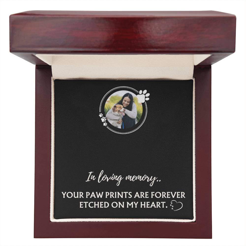 This elegant necklace features a cursive name design paired with a paw print symbol, creating a timeless keepsake they’ll treasure for years. Each piece is custom made with the name of your choice and paired with a photo you provide, making it deeply personal and one of a kind.