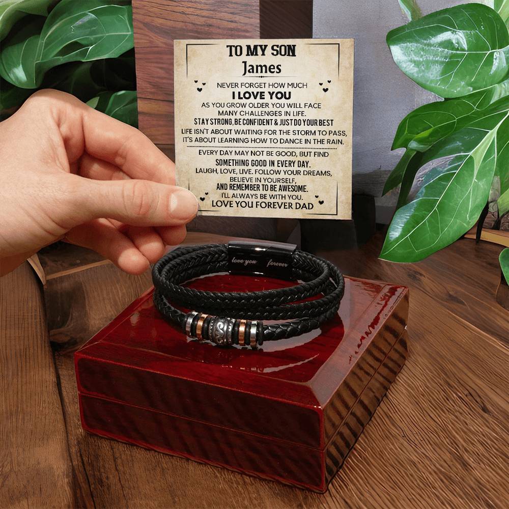 A meaningful gift your son will treasure forever. This braided vegan leather bracelet combines durability, masculine style, and a heartfelt engraved message: “love you – forever.”