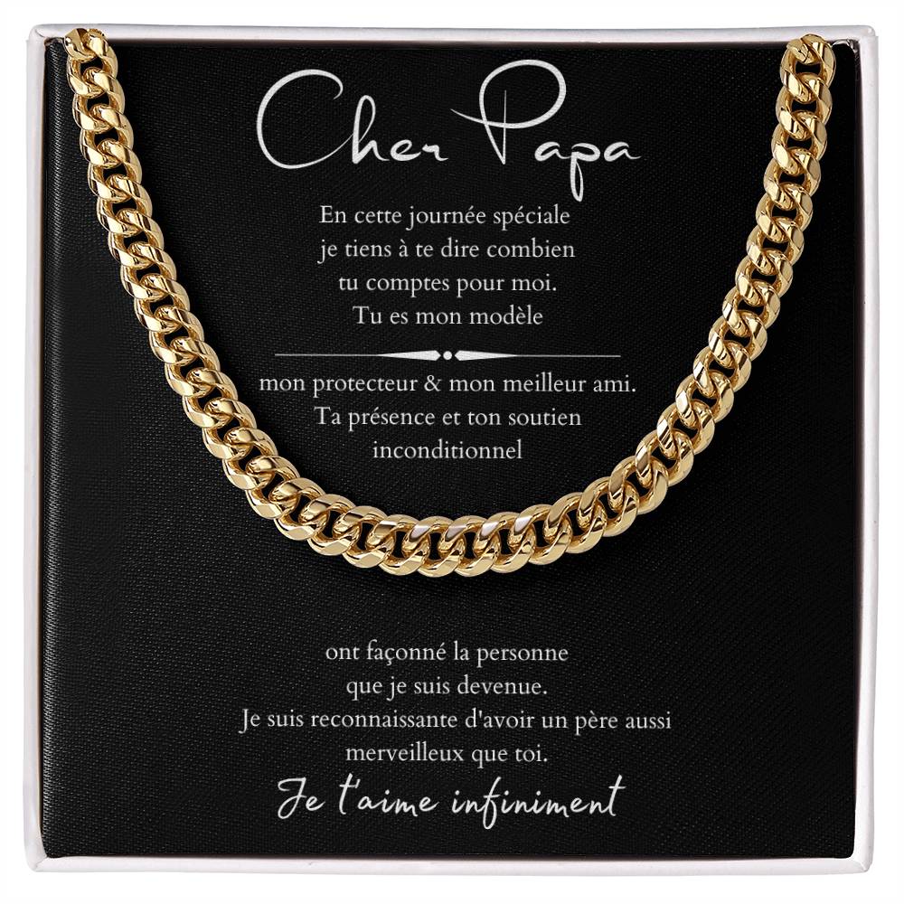 Offrez à votre Papa un collier classique qui met en valeur sa force et son style ! Notre Chaîne à Maillons Cubaine est le cadeau parfait pour toutes les occasions, y compris les anniversaires et les fêtes. Disponible en acier inoxydable poli ou en or jaune 14 carats, vous pouvez être sûr que ce collier merveilleusement lesté sera une pièce incontournable de sa garde-robe. Et comme la chaîne est ajustable, ce collier sera spectaculaire pour tous ceux qui le porteront. Acier inoxydable poli et or jaune 14 carats sur acier inoxydableLongueur de la chaîne réglable : 45,72 cm - 55,88 cmLargeur de la chaîne : 5 mmPoids : 28,5 grammesFermoir perroquetVotre pièce est soigneusement emballée dans une boîte douce au toucher gratuite pour un cadeau facile. Rehaussez votre présentation en passant à la boîte de luxe de style acajou, qui comprend un projecteur LED brillant.